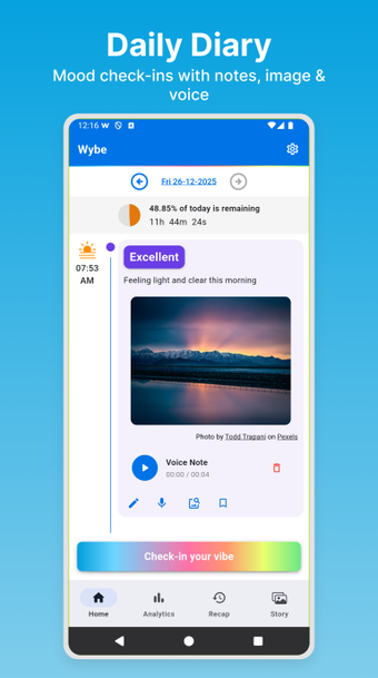 Wybe: Mood Tracker & Journal ช่วยให้คุณติดตามความรู้สึก ตลอดทั้งวันและให้ การวิเคราะห์ภาพรวมตอนสิ้นวัน เกี่ยวกับรูปแบบอารมณ์ ของคุณ คุณยังสามารถ เพิ่ม รูปภาพ ในบันทึกประจำวันของคุณและ ตั้งค่า การเตือนความจำ เพื่อตรวจสอบอารมณ์ของคุณในเวลาที่กำหนด.